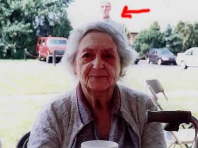 "A mulher na foto é a minha avó. Ela viveu sozinha até os 94 anos, quando sua mente começou a enfraquecer ela teve que ser transferida para uma casa de ajuda para sua própria segurança. No final da primeira semana, houve um piquenique para os moradores e suas famílias. Minha mãe e minha irmã foram. Minha irmã tirou duas fotos naquele dia, e esta é uma delas. Ela foi tirada no domingo, 17/8/97, e acreditamos que o homem por trás dela é o meu avô que faleceu no domingo, 14/8/84. Nós não notamos o homem na foto até o Natal de 2000 (a avó já tinha falecido), enquanto via algumas fotos da família na casa dos meus pais. Minha irmã achou a foto tão bonita da nossa vó que resolveu fazer uma cópia para a mãe, mas ainda assim, ninguém tinha notado o homem atrás por quase três anos! Quando eu cheguei na casa dos meus pais no dia do Natal, minha irmã me entregou a foto e disse: "Quem você acha que esse homem atrás da avó parece?" Demorou alguns segundos, eu estava absolutamente sem palavras. As fotos em preto e branco mostram que ele realmente se parece com nosso avô. "